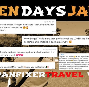 Experience Japan like never before with japanfixertravel! With permission from our travelers, here's a sneak peek at a five-minute highlight reel from a 40-minute video. Discover what it's like to have a fun, knowledgeable guide with top-notch video skills on your journey through Japan.